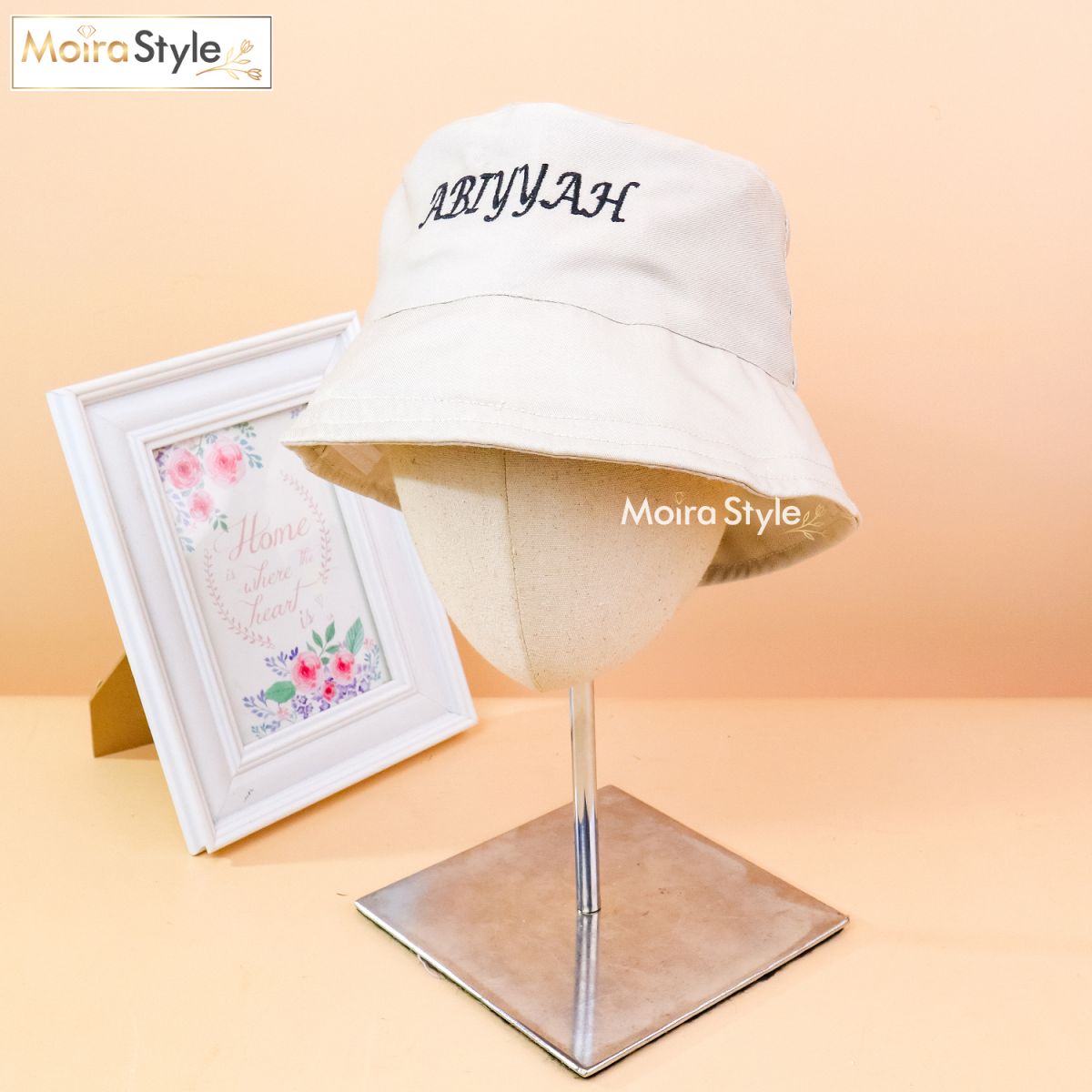 Topi Kania Anti Droplets Bucket Hat Anak Bordir Cream (Custom Nama)
